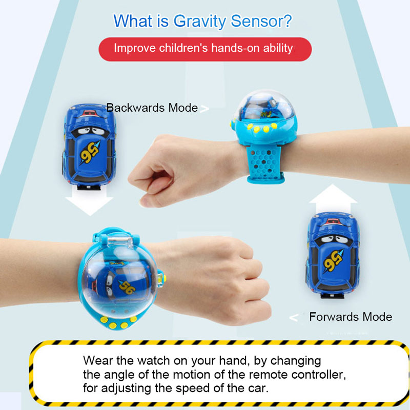 GRAVITY SENSOR - From an original capacitor of remote control watches and gravity sensor. Gravity sensor means: Wear the watch on your hand,by changing the angle of the motion of the remote controller,for adjust the speed of the car. This will improve children's hands-on ability,reaction capacity,coordinate ability